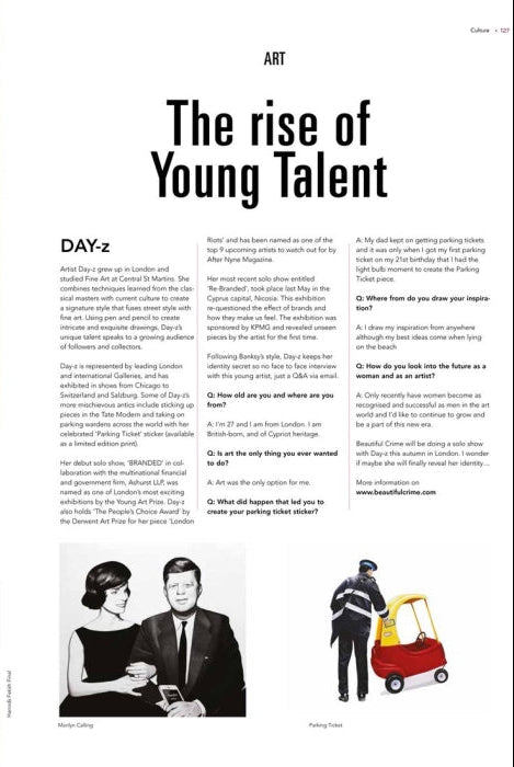 "Day-z grew up in London and studied Fine Art at Central St Martins. Combining techniques learned from the classical masters with current culture Day-z creates a signature style that fuses street style with fine art, using pen and pencil to create intricate and exquisite drawings, Day-z’s unique talent speaks to a growing audience of followers and collectors."